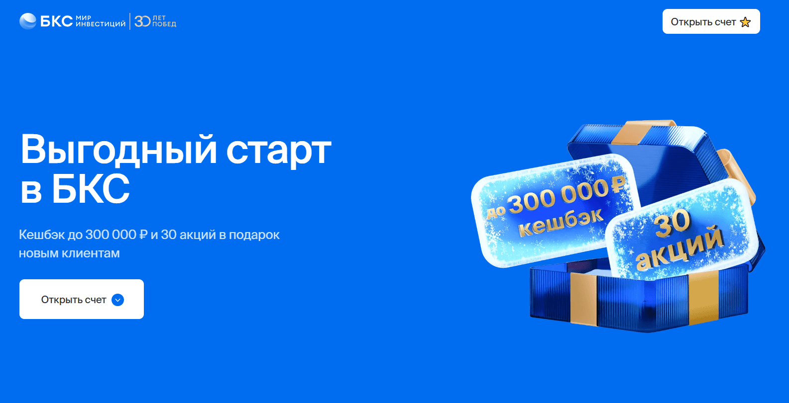 По акции "Двойной бонус» можно получить 30 подарочных акций и кэшбэк до 300 тыс. ₽