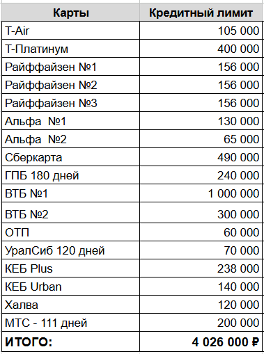 - Суммарный кредитный лимит: 4,026 млн.Р. по картам + 130,5 тыс. ₽ взято у брокеров